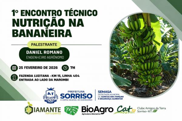 A bananicultura será tema do 1º Encontro Técnico Nutrição na Bananeira que acontece em Sorriso no próximo dia 25 de fevereiro, a partir das 07h. O evento será realizado na Fazenda Luzitana, localizada no km 15 da Linha 404, na saída para Lucas do Rio Verde, reunindo produtores, técnicos e profissionais do setor para um dia de aprendizado prático e troca de experiências.