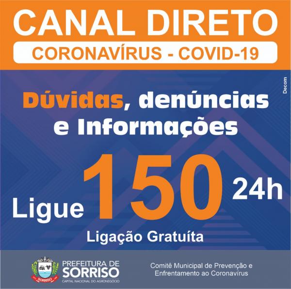 A central de informação sobre o Coronavírus(covid19) de Sorriso, que a tende pelo telefone 150, passa a funcionar a partir de hoje (08), 24h, todos os dias da semana, para receber denúncias, passar orientações e informações sobre este período de pandemia. As ligações para 150 são gratuitas.