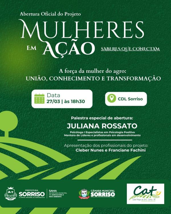 Nesta sexta-feira, 27 de março, será realizada a abertura oficial do projeto “Mulheres em Ação – Saberes que Conectam”. Com palestra da psicóloga Juliana Rossato, o evento terá início às 18h30 no auditório da Câmara dos Dirigentes Lojistas. Essa é a primeira das cinco etapas que antecedem a realização do XIII Fórum Regional das Mulheres do Campo. Além desta sexta, serão realizadas novas etapas nos dias 24 de abril, 27 de maio, 26 de junho e 24 de julho, findando com o Fórum em 26 de agosto. Os cinco treinamentos temáticos ao longo do ano de 2026 serão voltados à temas de inovação e tecnologia ao desenvolvimento pessoal e autocuidado.