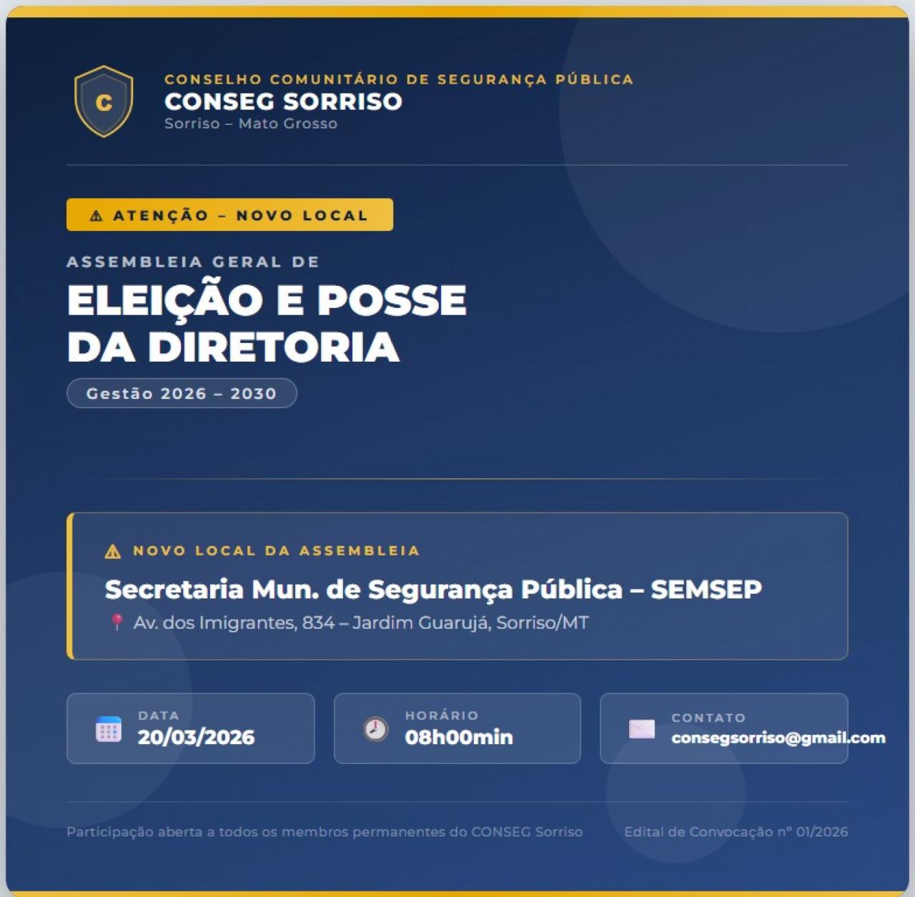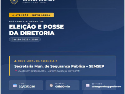 Gilvano de Ávila foi eleito, por aclamação, presidente do Conselho Comunitário de Segunda Pública de Sorriso (Conseg) para o quadriênio 2026 – 2030. Este será o terceiro mandato consecutivo de Ávila que terá como vice-presidente o empresário Nilson Molonha de Alencar.