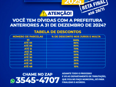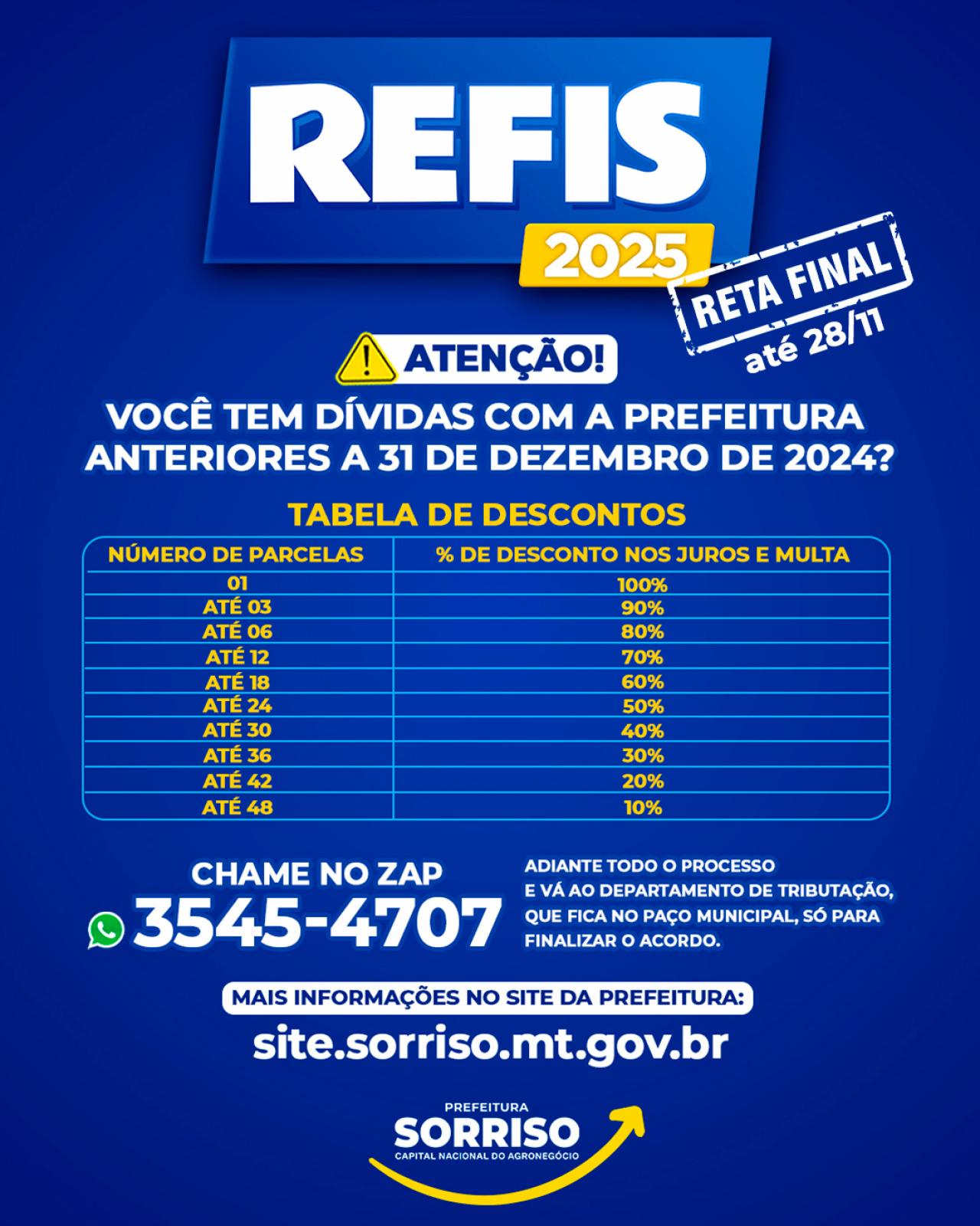 Tem dívidas com os cofres públicos municipais vencidos até 31 de dezembro de 2024? Lembre-se que termina no dia 28 de novembro o prazo para renegociação destes débitos com abatimentos de juros e multas. O Programa de Recuperação Fiscal de Sorriso, o Refis 2025, que terminaria em agosto, teve o prazo esticadinho, que se encerra neste mês.