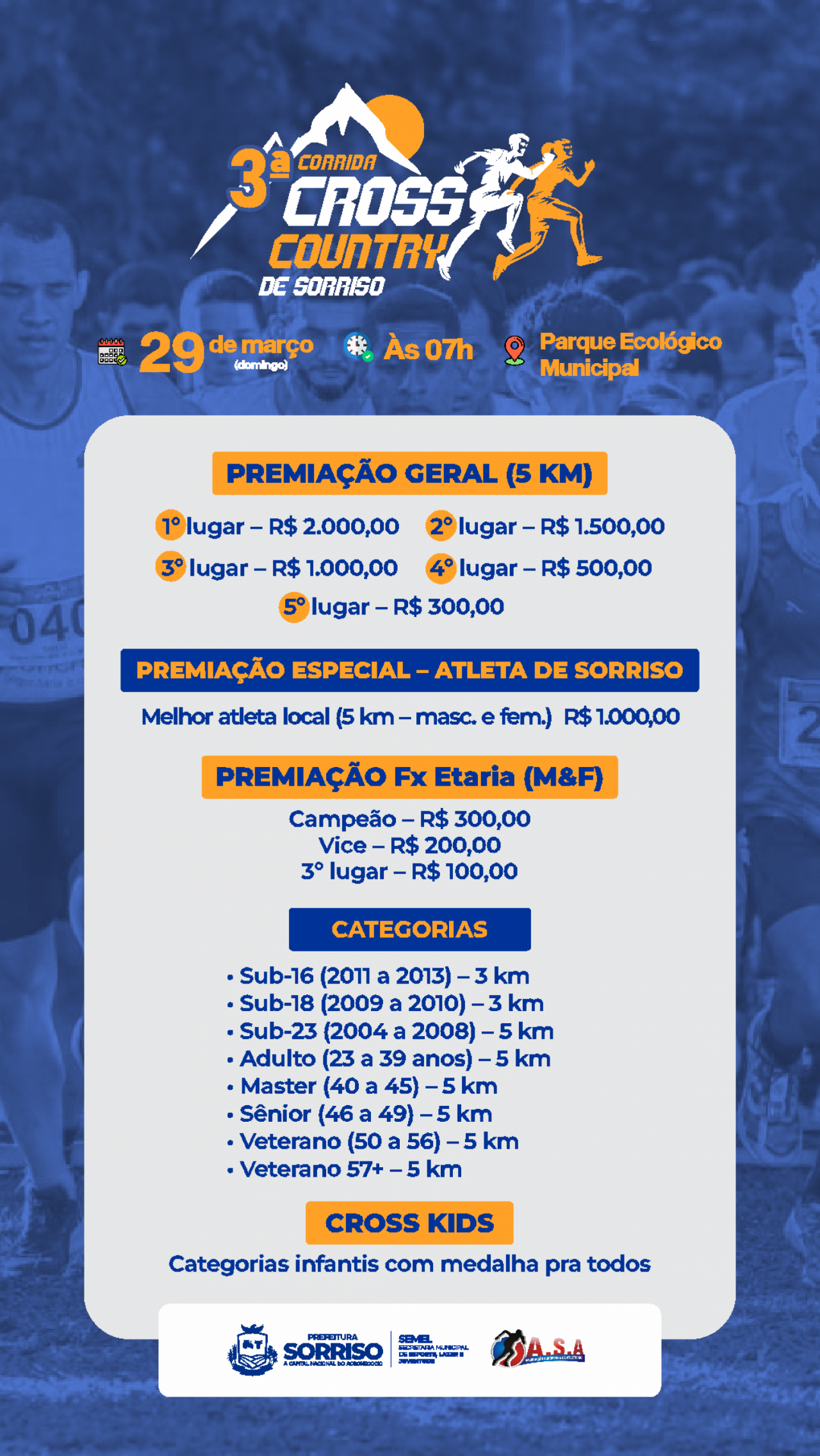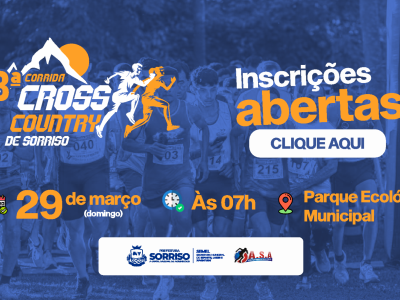 A Prefeitura de Sorriso, por meio da Secretaria Municipal de Esporte, Lazer e Juventude, realiza no dia 29 de março a 3ª edição da Corrida Cross Country. A prova será disputada no Parque Ecológico e contará com percursos de 3 km e 5 km.