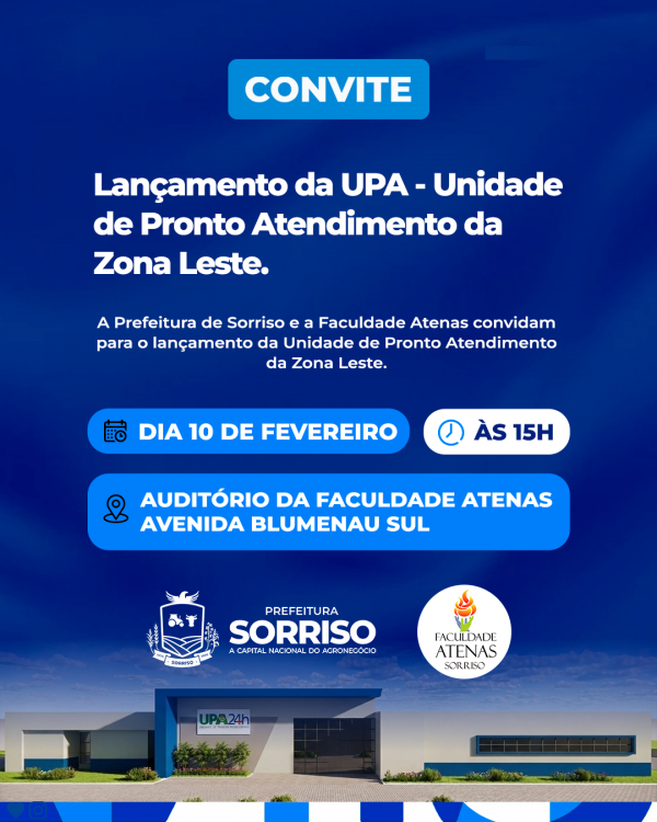 Avançar em saúde. Essa é a proposta da Prefeitura de Sorriso. e para isso, em parceria com a Faculdade Atenas o Município apresenta o escopo da Unidade de Pronto Atendimento (UPA) da Zona Leste nesta terça-feira, dia 10. O prefeito Alei Fernandes frisa que essa será uma Unidade não-hospitalar de atendimento às urgências e emergências com funcionamento nas 24 horas do dia.