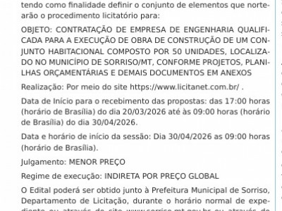Em Sorriso, uma das iniciativas do Ser Família Habitação, em parceria com a Prefeitura de Sorriso, é a construção de 50 casas para família em situação de extrema vulnerabilidade social. A ação, que envolve o trabalho direto de profissionais das secretarias da Cidade (Semcid), de Assistência Social (Semas), e da Mulher e da Família (Semfa), deve ser acelerada em breve, dado que, no dia 30 de abril, às 8h, será realizada a licitação para a construção das residências.