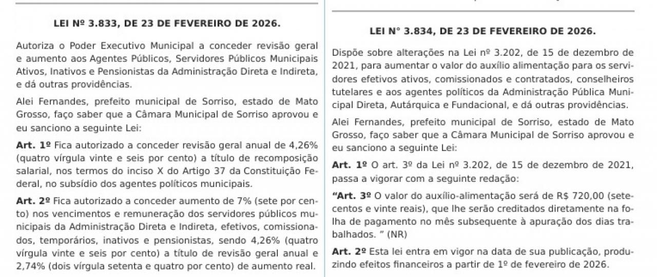 Estão publicadas no Diário Oficial Eletrônico dos Municípios do Estado de Mato Grosso desta terça-feira (24 de fevereiro), as Lei 3.833 e 3.834, sancionadas ontem (23 de fevereiro). Os dois documentos autorizam, respectivamente, a revisão geral anual e aumento de 7% aos servidores públicos municipais, 11,73% aos professores, bem como a elevação do valor do auxílio-alimentação.